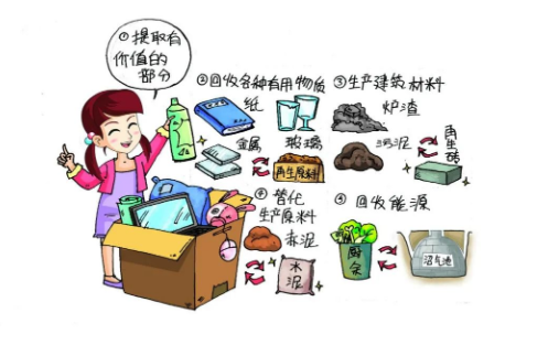 ②回收各种有用物质。例如,纸张、玻璃、金属、塑料等固体废物的再生利用。