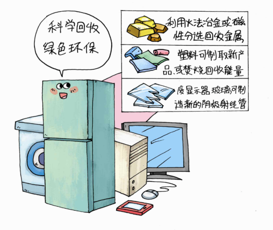 ③玻璃回收,例如利用废显示器玻璃制造新的阴极射线管,或者将电子产品中的玻璃用于其他生产。