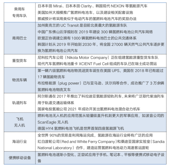 国际氢能政策及未来愿景是让氢能协助改善全球能源系统,应对气候变化,保障世界经济的可持续发展,国际氢能政策和应用在未来仍会延续既有趋势,继续加强制氢、储氢输运、氢加注、氢能终端利用等环节的研究与发展。世界各国的氢能研究者和参与者也在不断加强氢能技术研究交流、广泛实施氢能应用的开发示范项目,并尝试进行氢能应用场景的构建,虽然氢能应用场景目前尚处在早期,但已大致可分为乘用车专用车队、商用巴士、重型货车、物流车辆、轨道列车、飞机(无人机)、海运行业、便携移动设备等几大类。