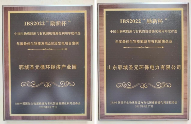 2022年9月27-28日,中国第十届生物质能源与有机固废资源化利用高峰论坛在杭州举行。颁奖晚宴上,郓城yl34511线路中心获颁IBS2022励新杯“年度最佳生物质发电&垃圾发电项目”及“年度最佳生物质能源与有机固废企业”两项荣誉。