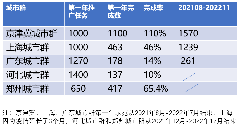 众所周知,氢燃料电池汽车作为氢能的先导应用,如今已经进入城市群示范推广的第二年。根据香橙会氢能数据库数据,从第一年推广情况来看,除了京津冀城市群超额完成之外,其他几个城市群完成情况均不理想(上海市因为疫情延长三个月完成目标)。详细如下: