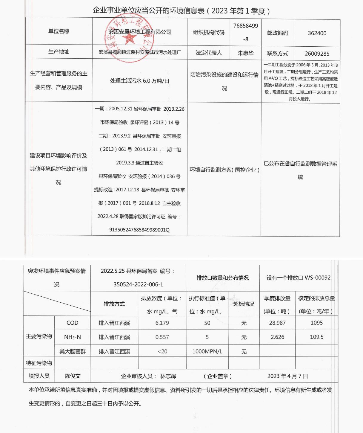 安溪城市污水处理厂2023年第1季度环境信息公开