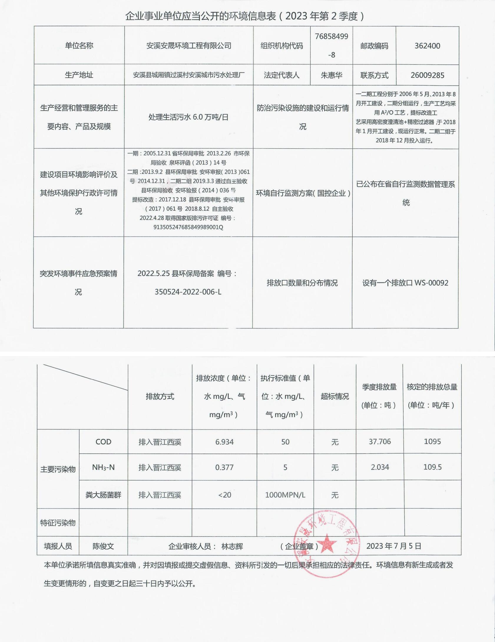 安溪城市污水处理厂2023年第2季度环境信息公开