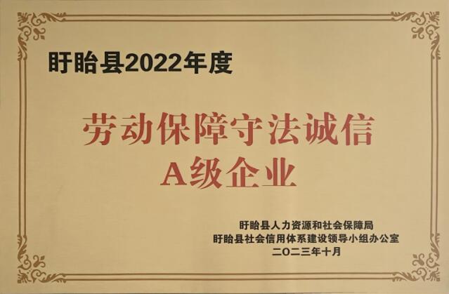10月30日,江苏yl34511线路中心荣获由盱眙县人力资源和社会保障局、盱眙县社会信用体系建设领导小组办公室颁发的盱眙县2022年度劳动保障守法诚信A级企业荣誉称号。