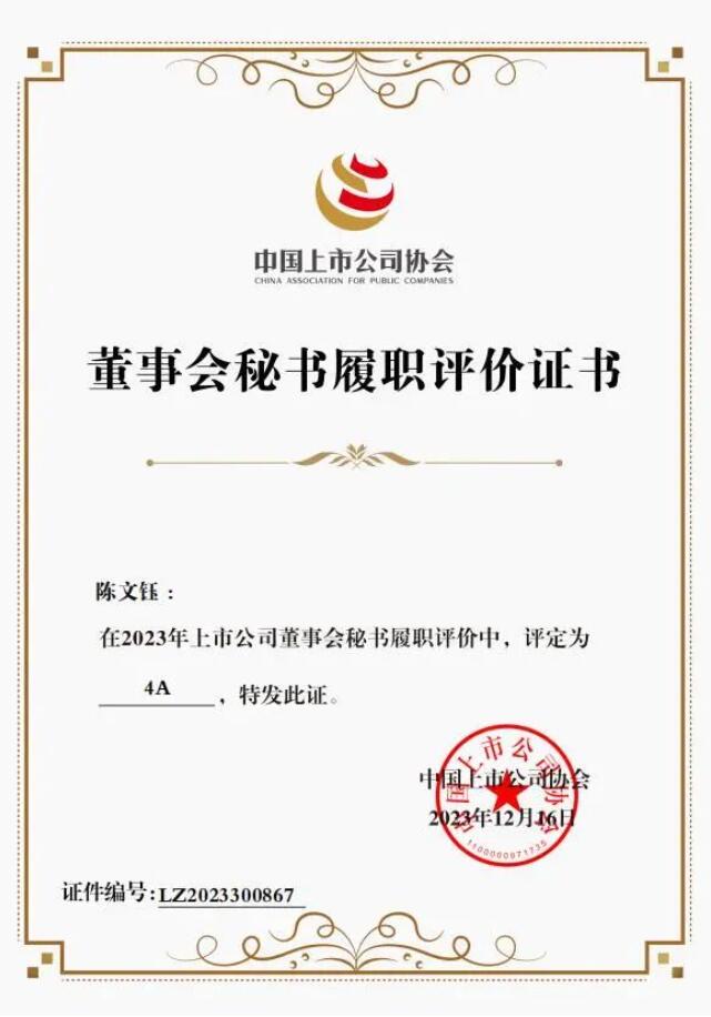 (三)yl34511线路中心陈文钰先生获2023上市公司董事会秘书履职评价4A评级