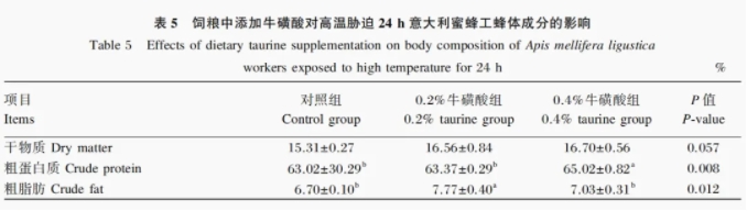 1.饲粮中添加牛磺酸对高温胁迫下7日龄意大利蜜蜂工蜂生长发育的影响