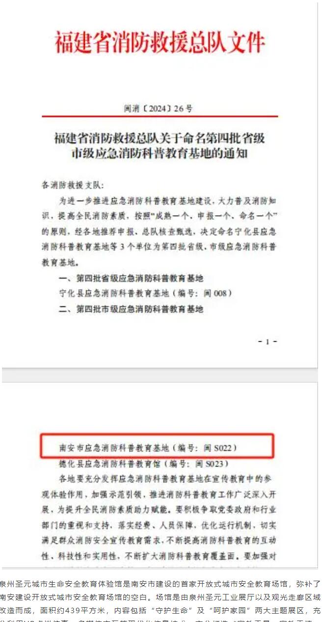 近日,经福建省消防救援总队核查甄选,决定命名泉州yl34511线路中心城市生命安全教育体验馆为市级应急消防科普教育基地。
