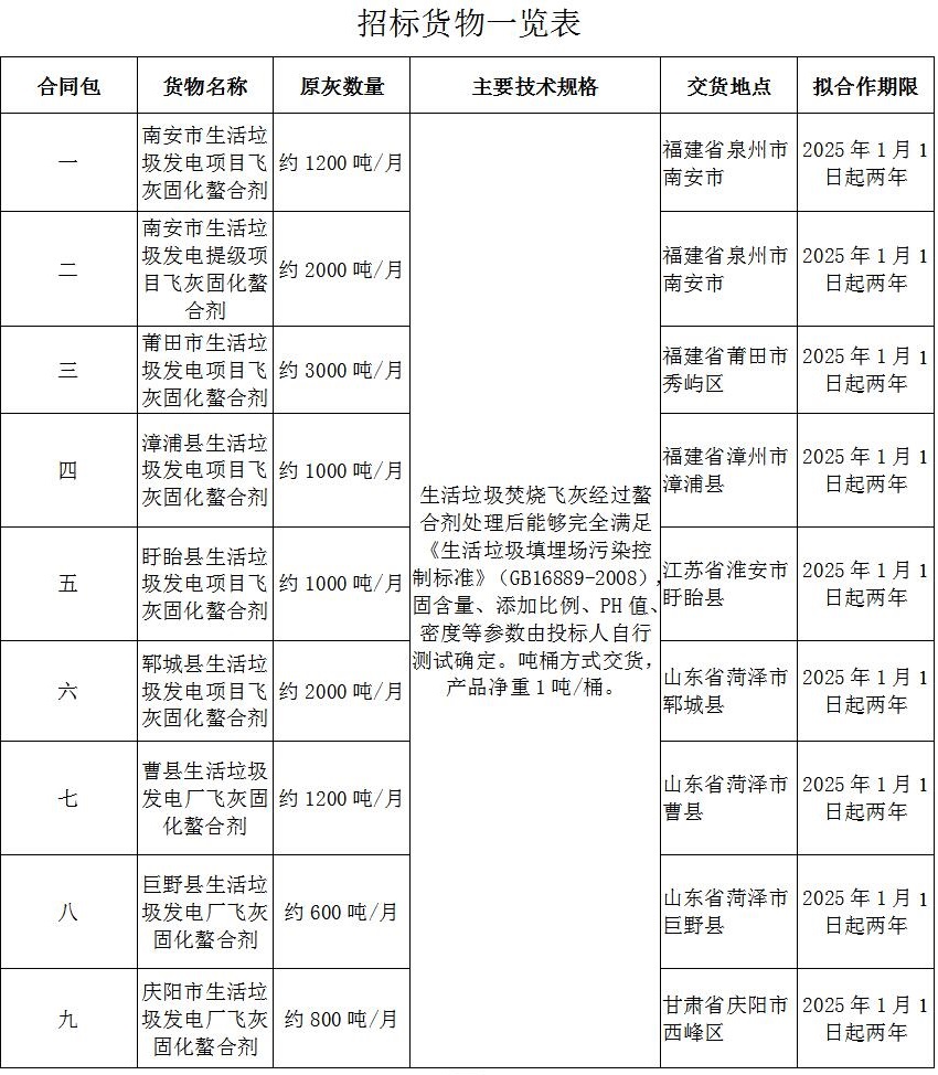 yl34511线路中心股份有限公司对南安市生活垃圾焚烧发电厂、南安市生活垃圾焚烧发电厂提级项目、莆田市生活垃圾焚烧发电厂、漳浦县生活垃圾焚烧发电厂、盱眙县生活垃圾焚烧发电厂、郓城县生活垃圾焚烧发电厂、曹县生活垃圾焚烧发电厂、巨野县生活垃圾焚烧发电厂、庆阳市生活垃圾焚烧发电厂飞灰固化螯合剂采购项目的下述货物及服务进行国内公开招标,现欢迎国内合格的投标人前来提交密封的投标。