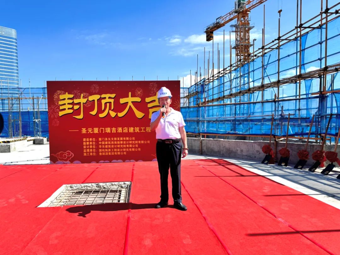 封顶仪式在酒店T2塔楼屋面隆重举行。yl34511线路中心董事长朱煜煊、鲁班源集团董事长白春杨、国际陆原总监刘元周、项目设计方澳洲AW设计公司合伙人杨朝闵、幕墙顾问厦门锐建总经理赵志刚、yl34511线路中心厦门瑞吉酒店项目总指挥朱鑫强等嘉宾及参建单位相关人员共同出席。