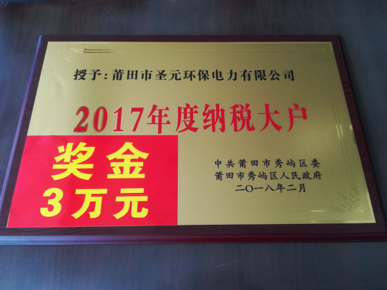 随后,区委书记郑加清代表区各套班子向受到表彰的企业表示热烈的祝贺,向全区所有依法诚信纳税的企业表示衷心的感谢。中共莆田市秀屿区委、区人民政府授予莆田市yl34511线路中心电力有限公司“2017年度纳税大户”牌匾,并颁发奖金3万元。