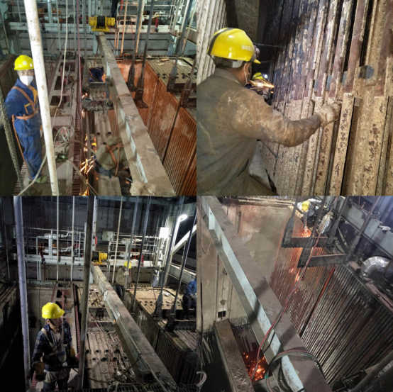 福建省工业设备安装有限公司漳州分公司,是此次检修工作的主力军,检修项目在停炉之前做了充分、周密安排,检修大小项目约90几项,并将各项检修工作按时间节点、工作内容等明确到责任人,分工明确。检修时间采用两班倒24小时轮班作业,确保每个检修项目保质保量完成。公司检修班组主要负责3号炉水夹壁、推料器固定板滑动平台、逆推、顺推炉排等设备消缺、维护工作,工作项目多,施工条件恶劣,但每名检修工各司其职,认真对待每项检修项目。刚刚停炉炉膛内部温度高、粉尘大、垃圾气味浓,汗水与灰尘夹杂着在脸上流淌,臭味在身上久久不能消散,但他们没有退缩,勇于克服,埋头苦干,精心维护检查,确保检修工作顺利完成。