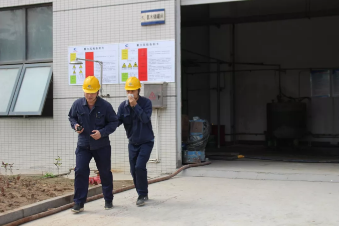 9时30分,演练正式开始。两名巡检人员发现氨水接卸作业时氨水泄漏、1名操作人员轻微中毒,逐级上报后,应急领导小组决定启动部门级应急预案。