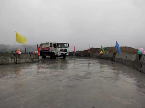 垃圾运输车驶上栈桥