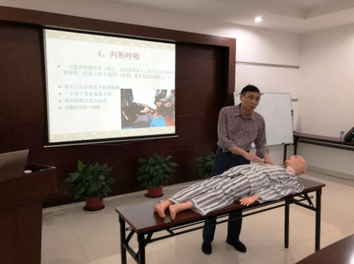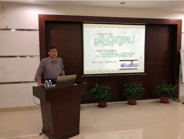 环保行业工程项目及生产任务重,施工和生产作业较多,风险性大,学习心肺复苏及工伤事故等急救方法实属必要。培训中,陈院长为大家普及急救知识和技能,他首先介绍拨打120的注意事项,心脏呼吸骤停的判断技巧,重点讲解心肺复苏的定义、操作程序、注意事项,以及心肺复苏有效表现和终止条件,并利用实物人体模型进行细致规范的现场演示。随后,针对电厂日常工作中常出现的工伤进行急救措施讲解,并结合发电行业职业病防治知识和应对措施做了解说。